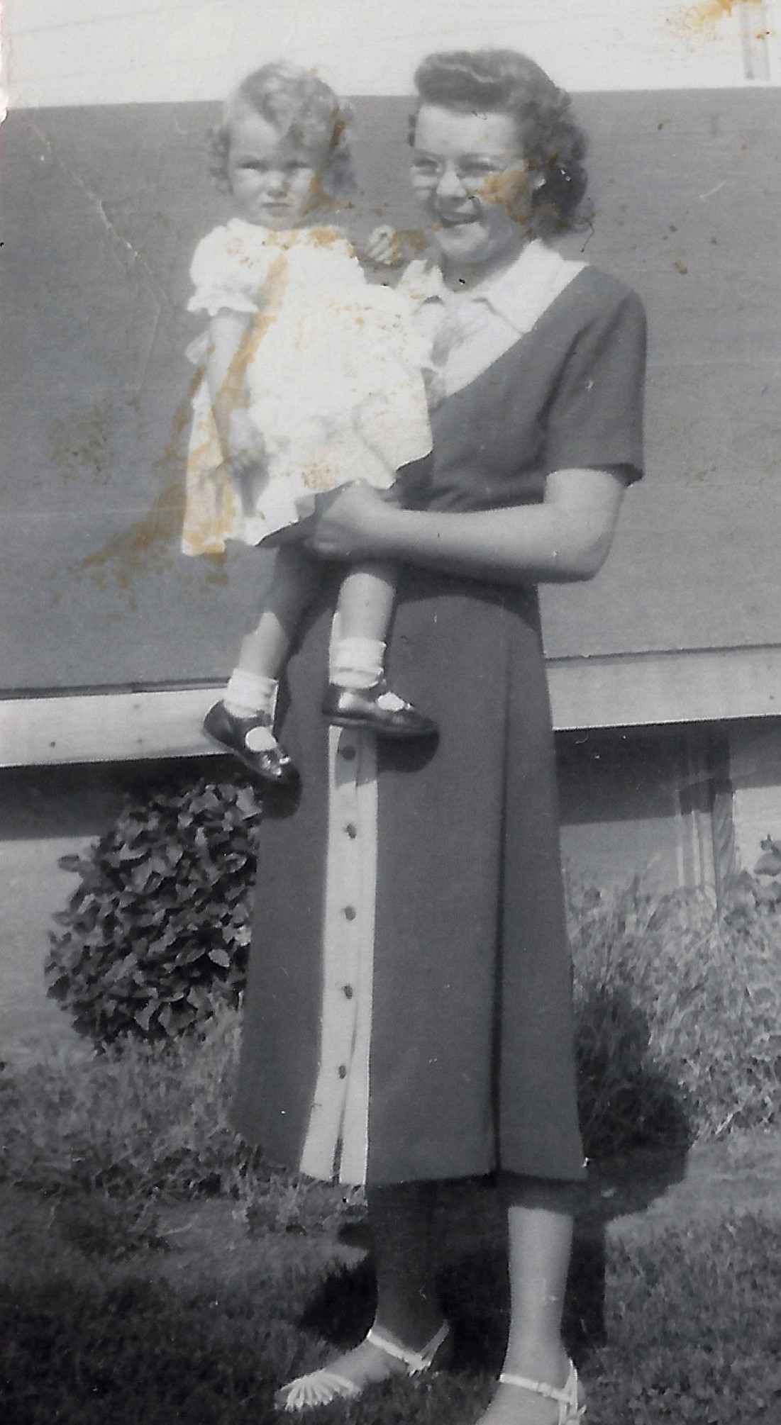 Pat and Mom in front of the basement house
