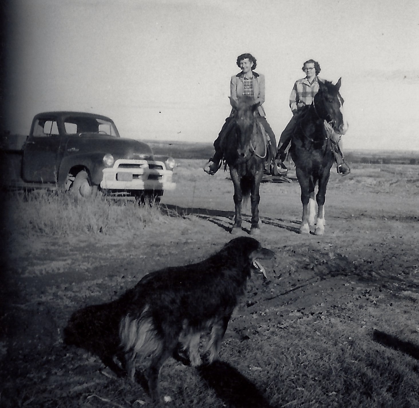 Aunt Iona on Gypsy and Mom on Nipper in our driveway