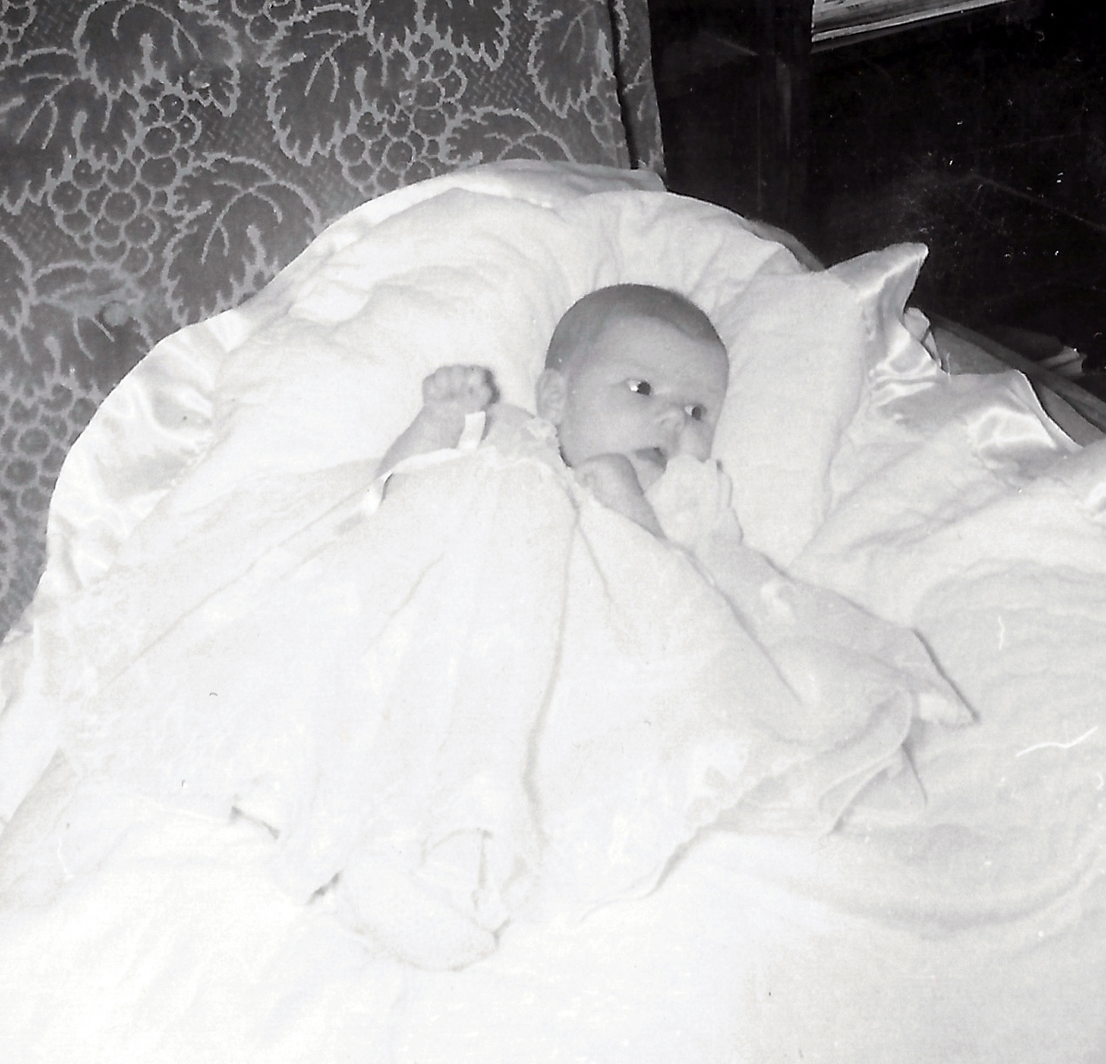 In a few days the doctor put me back in the hospital and this time he got things going, but I really had a hard time. The baby was twisted and trying to come wrong. It was the hardest and longest labor I had with any of my children. But finally my third dear little baby son was born on February 23, 1945. He was so precious and tiny. I was so thankful he was here and alright. How I wished his father could see him. I had someone send Rodney a telegram. The doctor asked me what I was going to name him. For months I had planned to name him Michael, but I told Dorthy what name I had picked out. She had a baby three weeks before me and she took my name. I could not believe she would do that, but she did. So now I had no name, I told the doctor I guess I would name him Jimmy. The doctor said, "Oh don't name him Jimmy or he will be so embarrassed if he ever goes into the service and they call out Jimmy. Name him James and just call him Jimmy." I really did some thinking that night and wished Rodney was there to help me. I finally settled on Richard Lee. When I told the doctor he said, " Now that's a real nice name, now that's a name." And my tiny baby started to look like a little Richard.