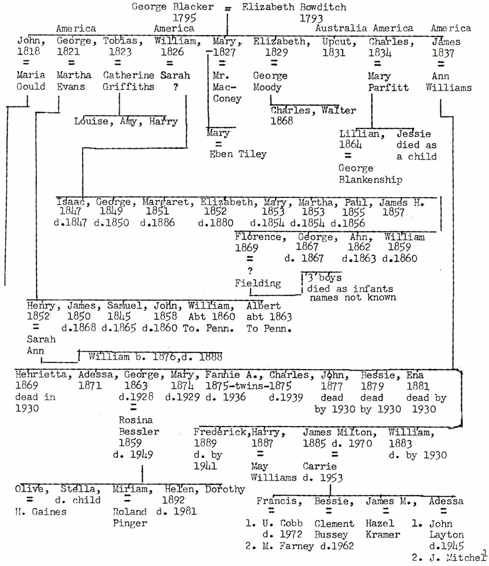 George Blacker was born 4 March 1795 in Cameley, Somersetshire and died 10 May 1874, in Clutton. Elizabeth Bowditch was born 11 December 1793 in Timsbury Worcestershire and died 12 May 1865 in Clutton.