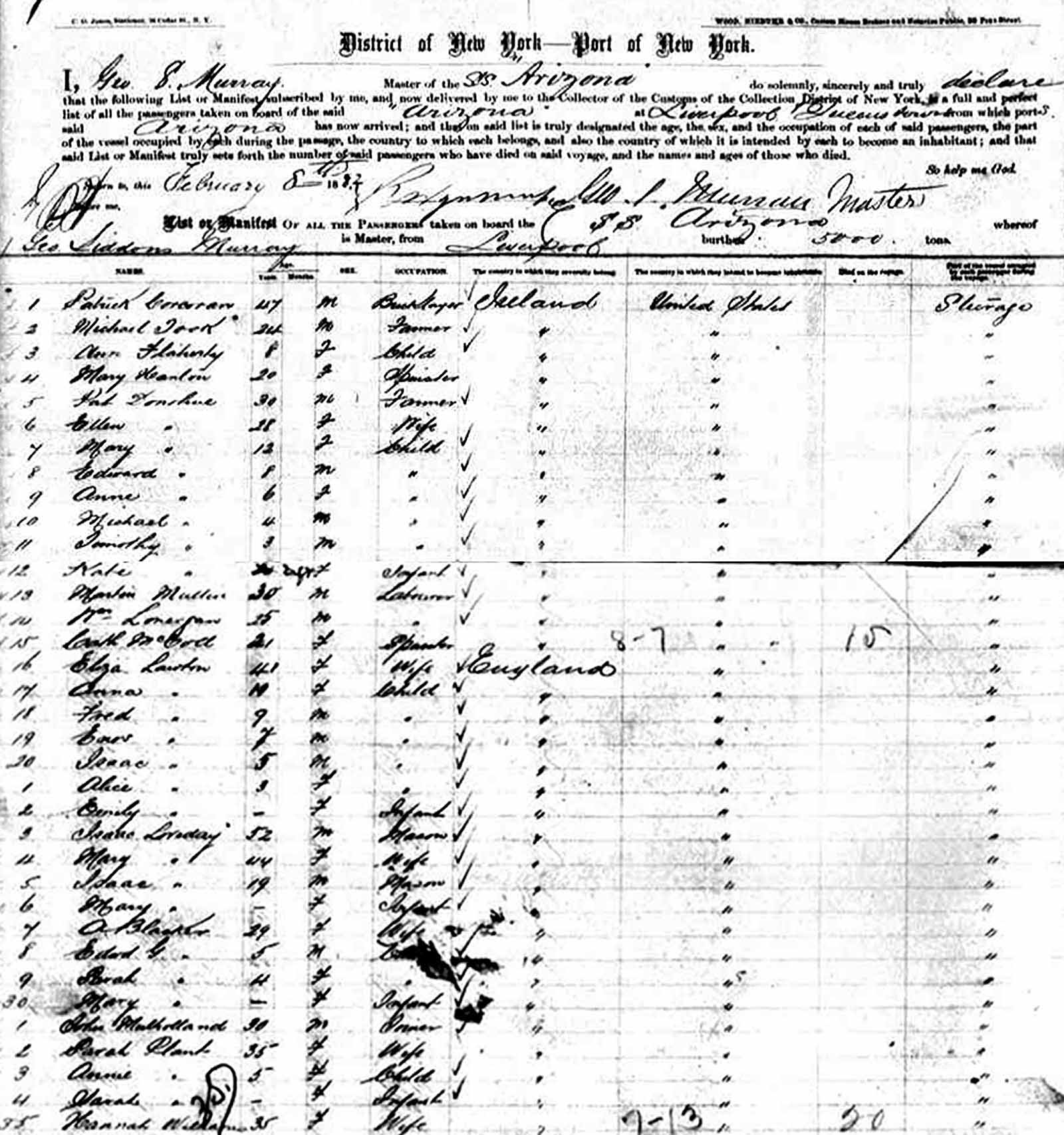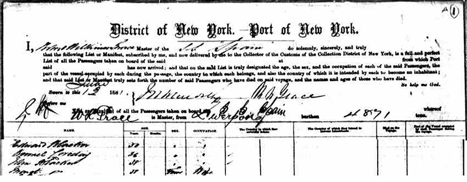 Due to the increased availability of records, it has since been discovered that on June 12, 1881 the manifest of the ship SS Spain, docking in New York City from Liverpool, lists Edward and those who were with him.