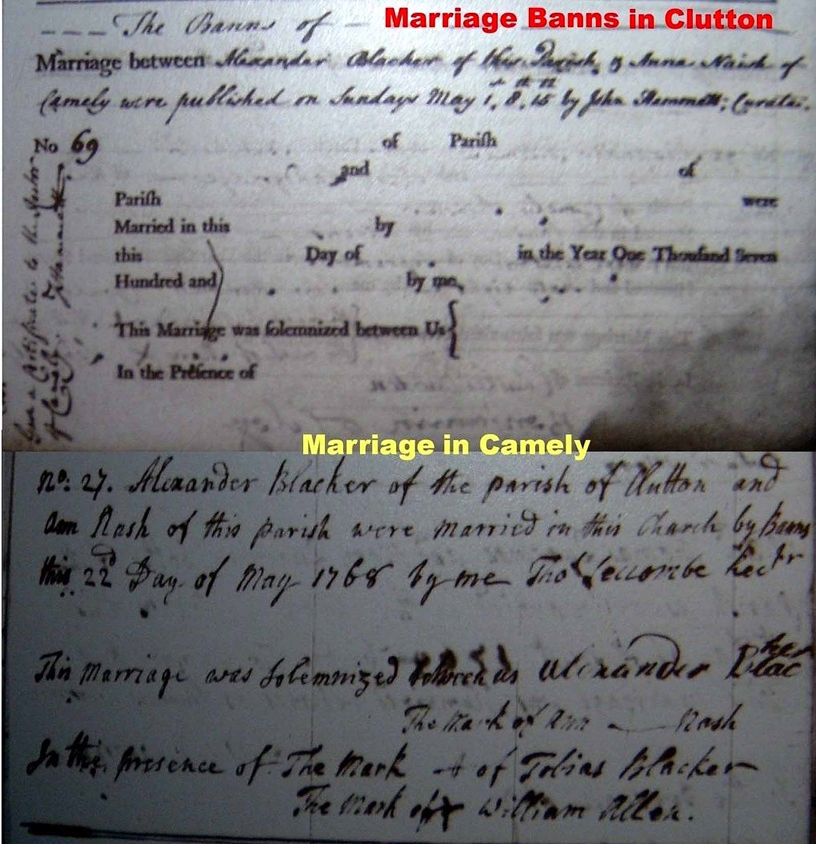 The marriage banns for Alexander Blacker and Ann Naish are shown at the top