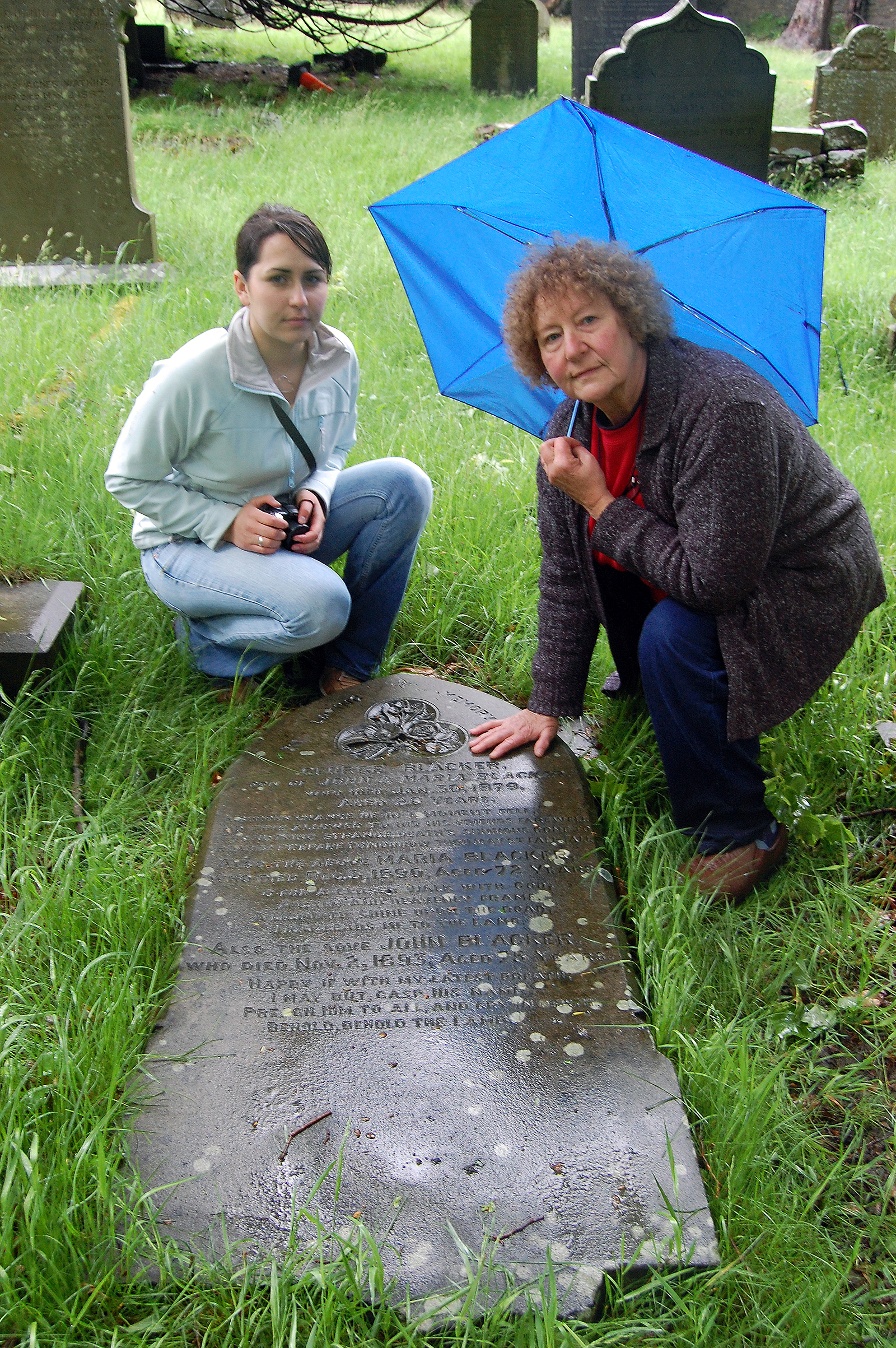 Ruth Blacker Waite and her grandaughter Mariah Waite in the Mountain Ash Aberffrwd Cemetery next to the tombstone of John, Maria and George Blacker