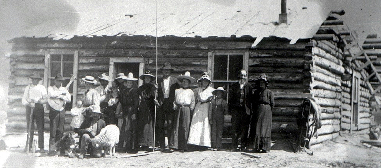 Picture taken while visiting the Brooks home in Wyoming around 1906. Will Blacker with shot gun, Ed Wilkes with guitar, his wife, Mary Blacker Wilkes and baby Arvilla on chair. Kneeling front: Mr. Brooks with sheep and dog, Thomas Blacker in hat near door holding 9 month old, Theadore. 2 ½ year old Leroy standing on stool with feet just above sheep’s back Back: Mrs. Brooks in doorway. Hettie Wilkes Blacker at front doorway with high crown straw hat. 19 year old Merintha Blacker with bamboo fishing pole, Brig Gardner with right hand on fishing pole. 1 ¾ year old Delos Gardner held in left arm of father with face behind mother’s high crown hat. Maria Blacker Gardner in white blouse, dark skirt. 14 year old Fannie Blacker in white dress and bonnet, 9 year old Kemuel Blacker. Grandpa and Grandma Edward and Althera Blacker
