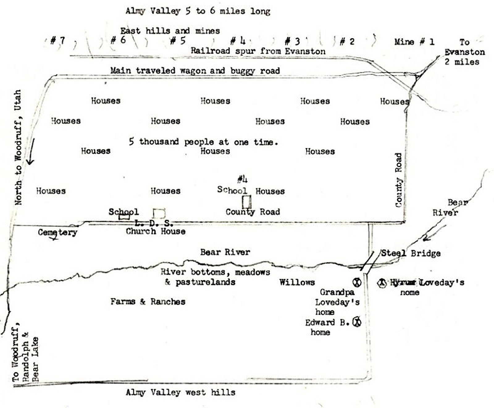 Again, returning to our families, there is little to report excepting eventually, they became settled in their respective houses. How it was done we don't know, but three houses became available in a single neighborhood. As one follows the sketch of the area shown above, leaving Evanston, the road to Almy is picked up in the bottom right hand corner which first leads to Mine #1. Leaving the main road and turning to the west on the County Road for approximately one mile, the road makes a right hand turn toward the north. After approximately 1/4 of a miles, another road turns to the west and within another 1/4 mile one comes to a steel bridge crossing Bear River. Within one or two hundred yards of the bridge was the house the Lovedays moved into. Another hundred yards or so on the same side of the street became the home of the Edward Blacker family and back near the bridge, but on the south side of the road, was a home Uncle Hyrum Loveday and family moved into.