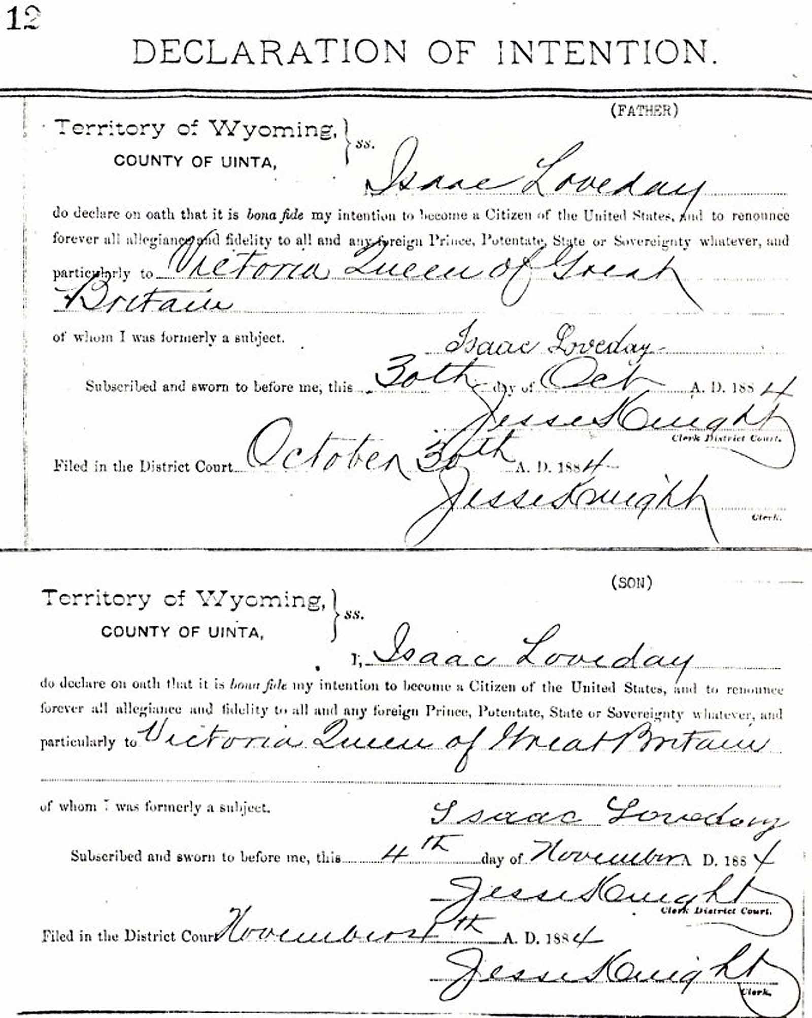 Of first importance may be confirmation of the fact that the families under discussion actually arrived in Almy. This can be done so far as the Loveday family is concerned. In an attempt to find confirmation, a visit was made to the Uinta County court house in Evanston in search of any type of affidavit to show if there were land records in the names of members of the families, and/or to determine if any attempt may have been made for a change of citizenship. Disappointment was the result so far as the Blacker family was concerned, but in the Clerk of Court's office, a record was found where Grandpa Isaac Loveday had declared his intention of becoming a citizen of the U.S. A photo copy of his declaration was obtained. This step was taken by him on the 30th of October 1884. Five days later, his two sons, Hyrum and Isaac Jr., on the 4th of November 1884, likewise, made similar declarations. There were no indications of their wives' intentions.