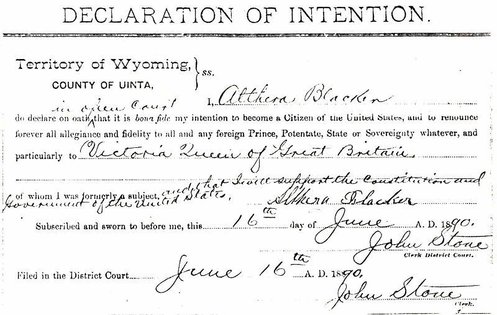 Althera Blacker's declaration of intention to becoma a US citizen
