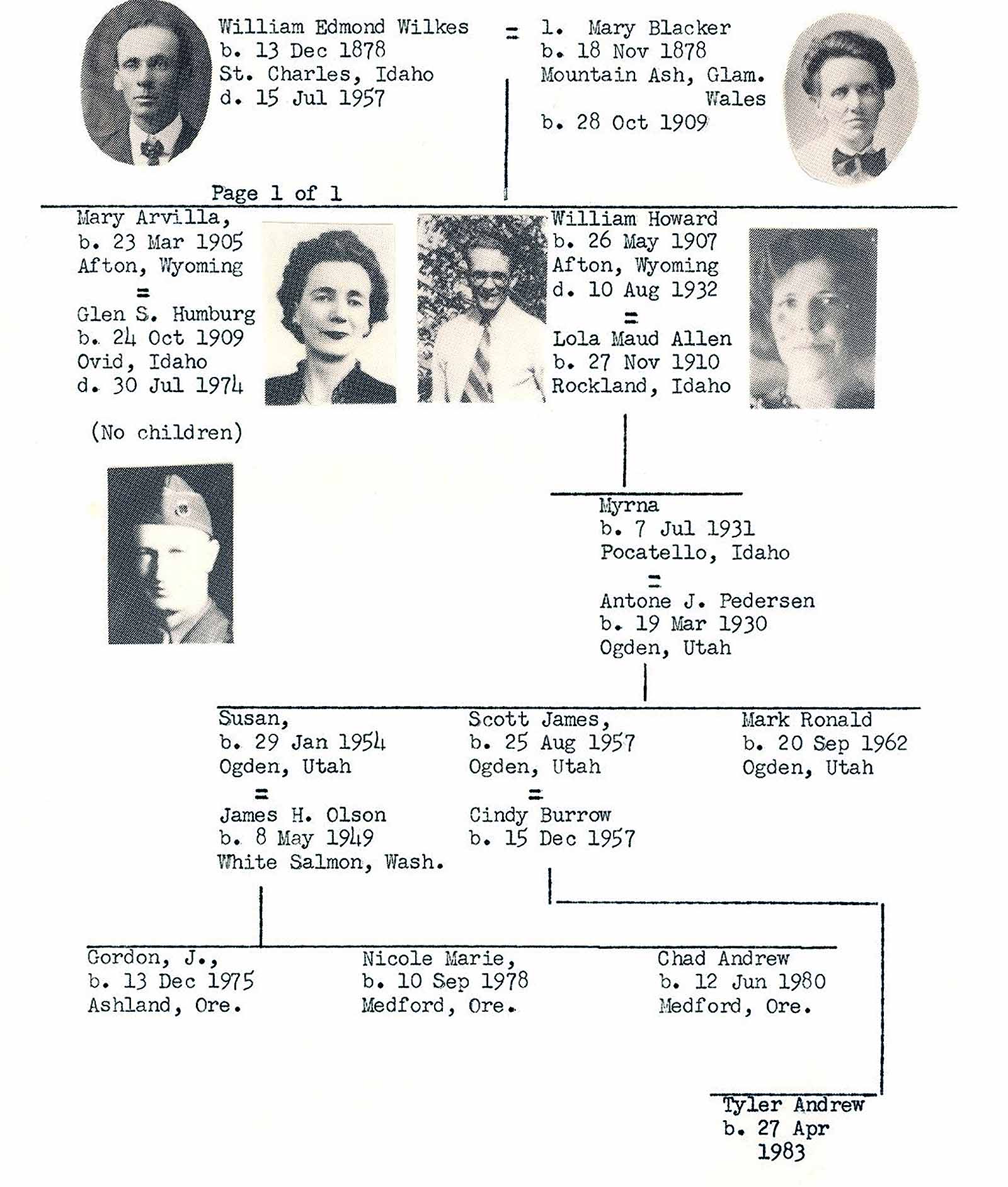 A normal family is formed by marriage, children are born and raised, and they, in turn, start the cycle again by marrying. The Blacker family proved no exception. Prior to the turn of the century, in fact five years prior, the two eldest, George and Sarah Ann, actually, Sarah Ann first by a month, married and started homes of their own while the family yet was living in Almy. Perhaps, at this point a marriage chart could be formed showing what the family status was at the time of the move from Almy to Star Valley. This covers the few years before, and including, a very few years following the century's change. Also, additional marriage dates for the entire Edward Blacker family. A simple chart, at times, can show much more actual history than can be shown in any other manner. The three eldest did not go to the Valley. Mary eventually did.