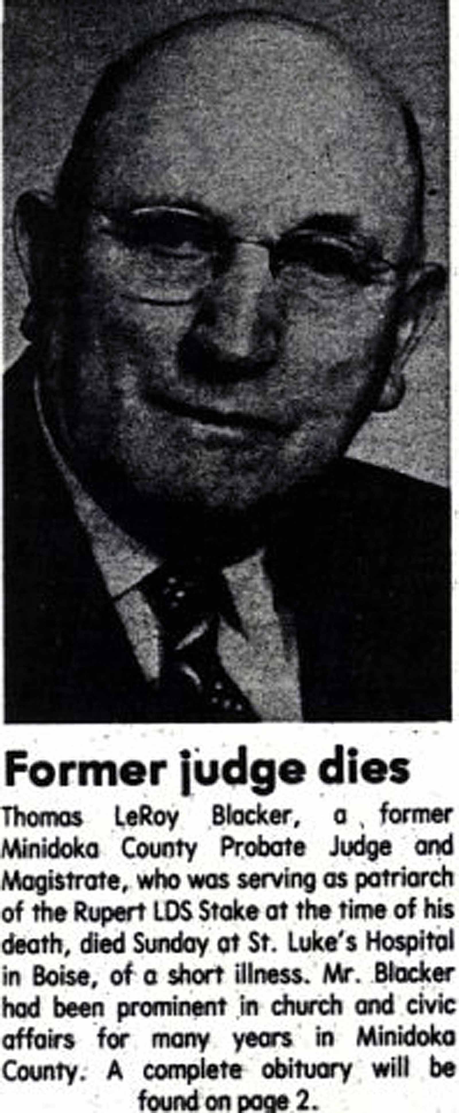 Mrs. Blacker has been ill for a long time and while we are all grieved to hear of her passing, we are comforted by the thought that she is now past all suffering and laid at rest. Funeral services were held in the North Ward Chapel Monday.