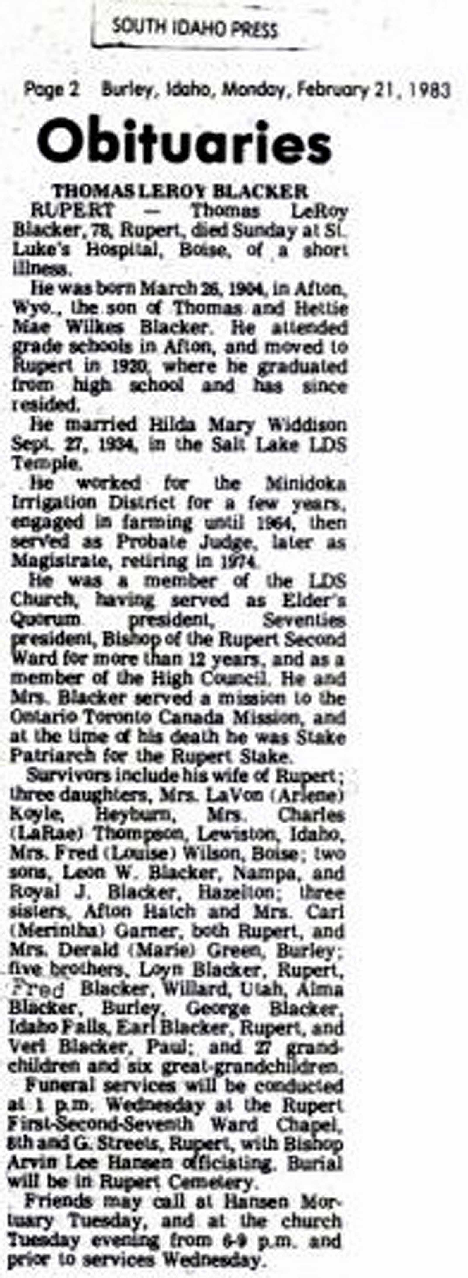 Mrs. Blacker was born in Wales on January 3, 1852. She is the mother of eleven children, eight of whom are living; they are George Blacker of Cumberland, Wyoming; Sarah Ann Nisbet of Acequia, Idaho; Thomas Blacker of Rupert, Idaho; Maria Gardner of Afton, Wyoming; William Blacker of Rupert, Idaho; Merintha Williams of Salt Lake City; Fannie Cazier of Afton, Wyoming, and Kemuel Blacker of Salt Lake City. All of her children were present except one who was ill. She has sixty grandchildren and is survived by her youngest brother, Kemuel Loveday who was present at the funeral services.