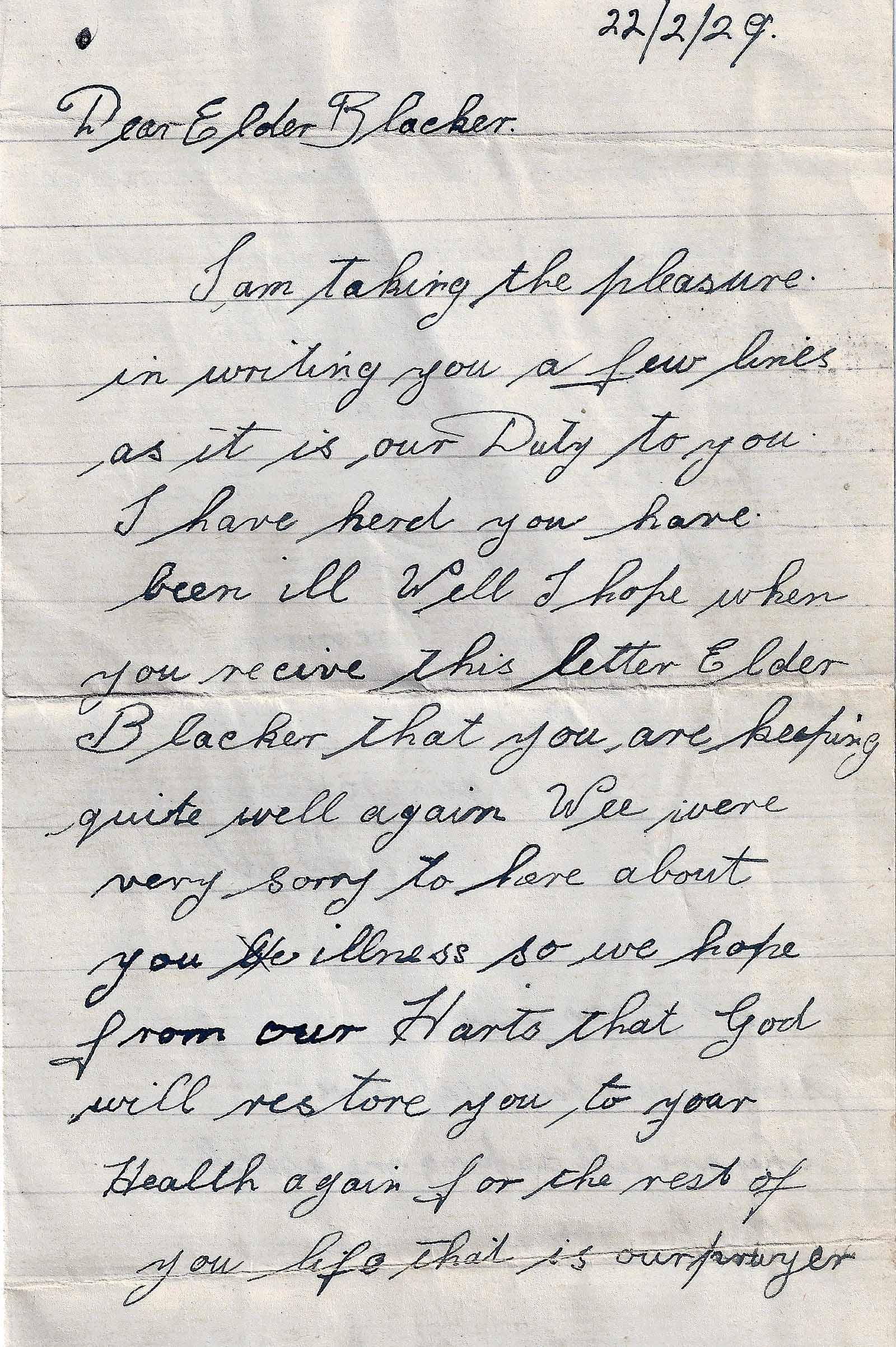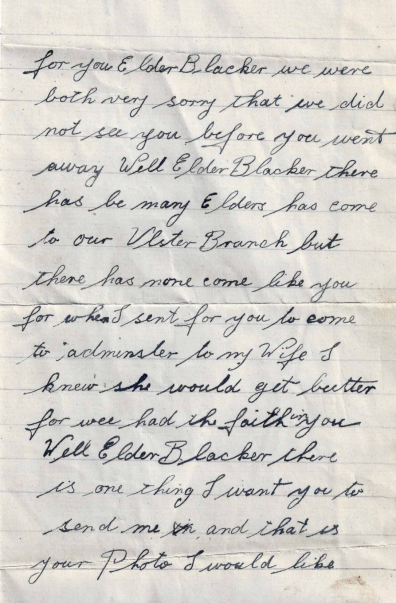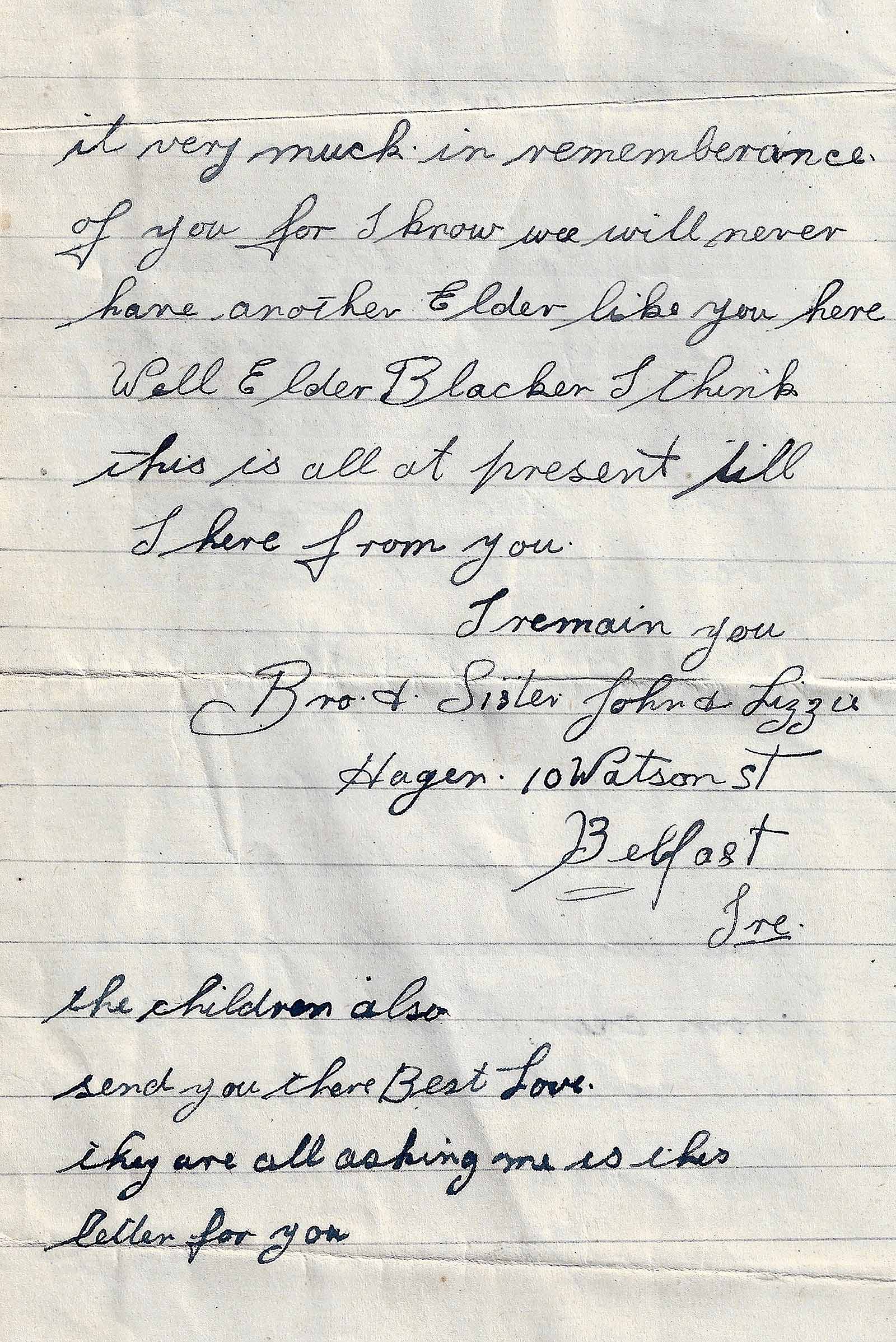 It was while working in Belfast that we attended a meeting and were late returning home. When we arrived we found a note under the door from Brother John Hagan who asked that we go as soon as possible and administer to Sister Hagan who was very ill. It was rather a long way to walk but we had to do so. It was also a stormy night but we gladly went. Brother Hagan and family were poor and crowded in their little house, and Sister Hagan was a very sick woman. Elder Brough anointed and I sealed the anointing. I felt the Lord would bless her and promised her that He would and the promise was fulfilled. In a letter received from Brother Hagan after I had left Ireland, he said that they believed firmly that Sister Hagan was alive and well only as a result of our administration.