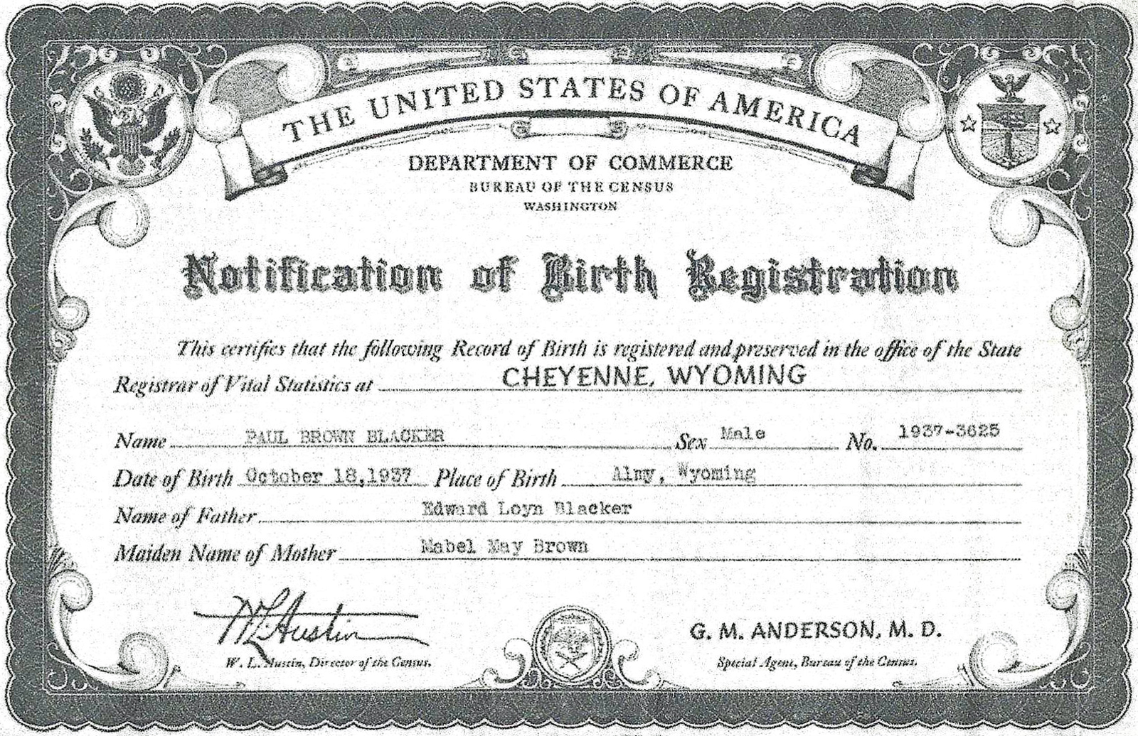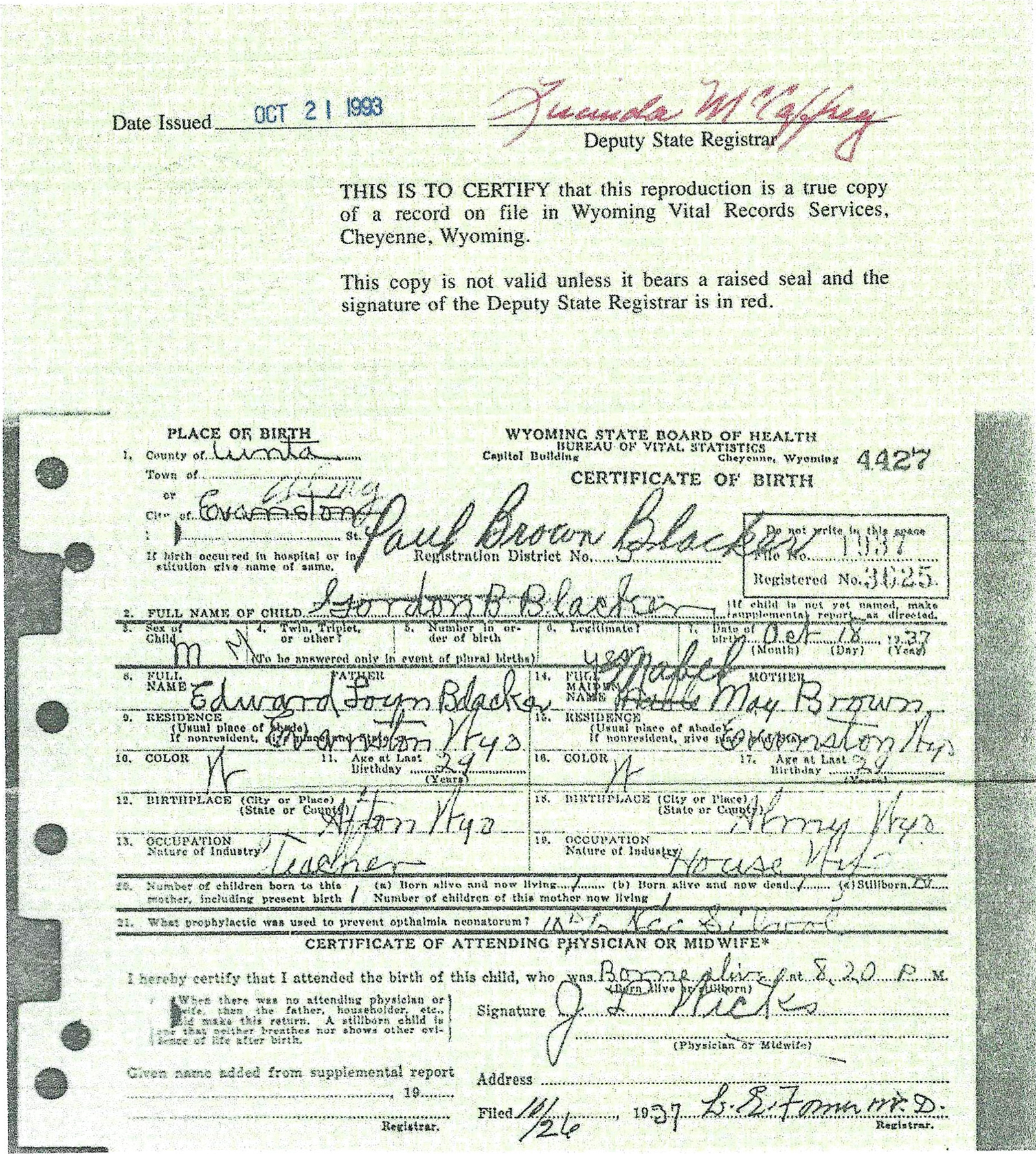 Ford, Bacon and Davis received an unusual contract to work for the government of Morocco to design a 250 mega watt electric power plant that would directly burn raw oil shale. I needed to get a renewed passport very quickly so the company contacted our congressional office who put in an expedited request while I gave them my required information over the phone. Several days latter the passport showed up but along with it came a copy of my birth certificate issued by the State of Wyoming. It shows changes, first, with the name of Mom corrected from Mabie to Mabel, the place of birth was changed from Evanston to Almy, but my original name was Gordon B. Blacker. I remembered something that Mom had said about me originally being named Gordon but I had no other recollection.