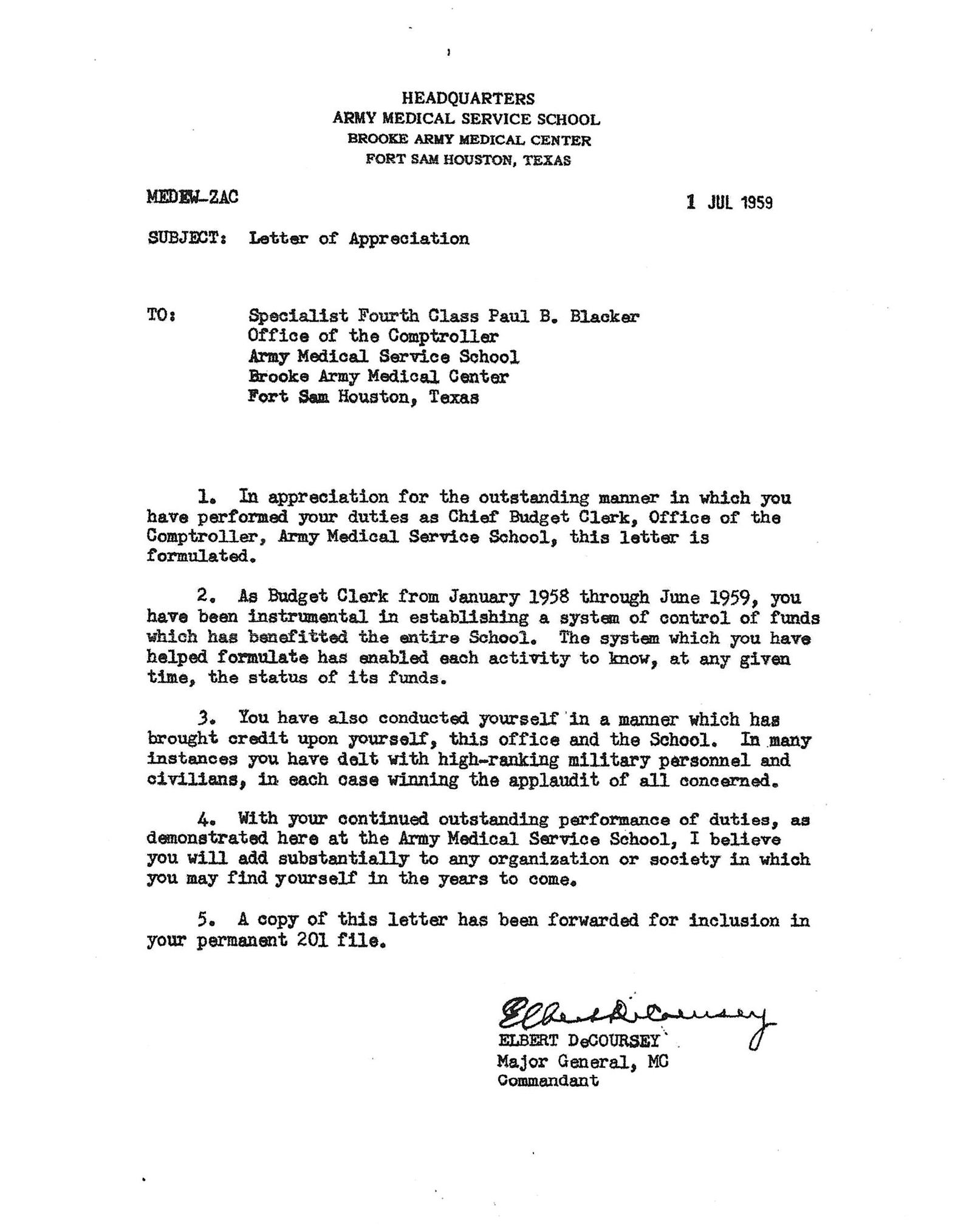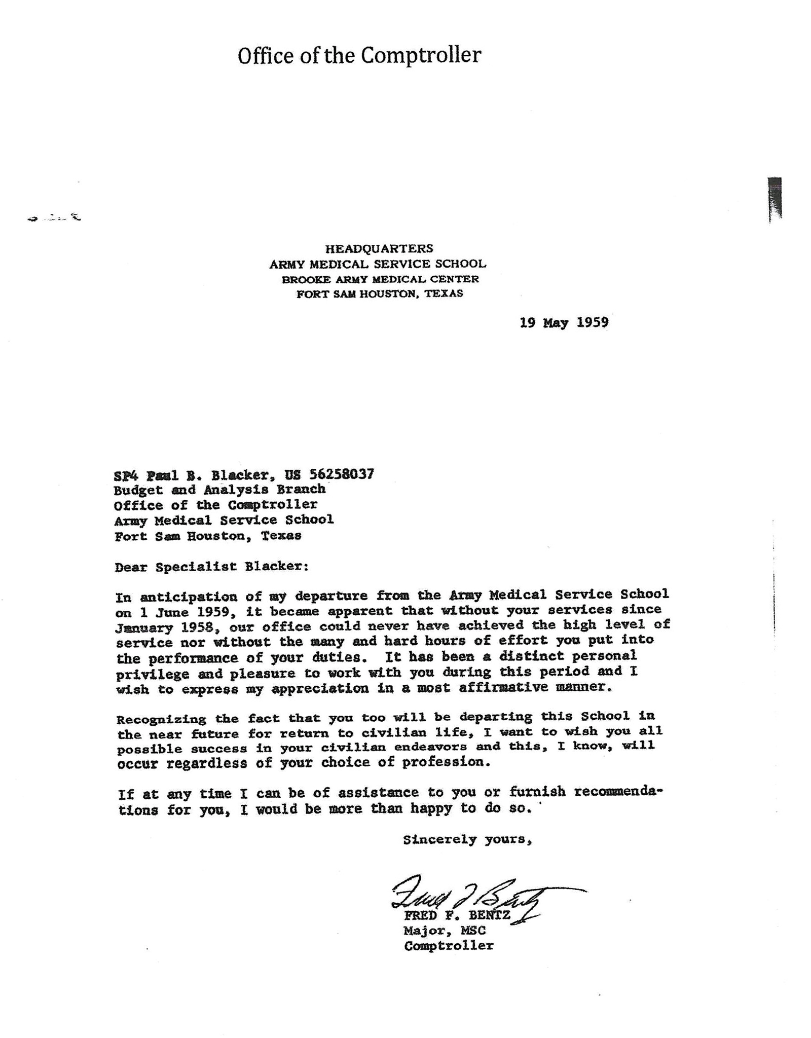 After completion of basic training, I was assigned to attend Army Administration Course in Ft. Leonard Wood, Missouri. On my way I was granted two weeks leave and stopped in Rupert, Idaho, where my parents had moved. After two months in Ft. Leonard Wood, I was assigned a permanent duty at the Army Medical Service School, in Ft. Sam Houston, San Antonio, Texas. I was trained as a Budget Clerk in the Office of the Comptroller. I spent the remainder of my two-year service responsibility in that position. Because the position required me to have access to sensitive information, concerning budget amounts and expenditures, I was granted a Secret security clearance. Then because of my Secret clearance, I was ordered to help part-time at another program at the Army Medical Service School, the nuclear weapons burn center, where I assisted with the packing and moving, storing boxes of secret nuclear effects data. This got me involved in the Army's nuclear testing program that was being conducted at the Nevada Test Center. I not only assisted in the safeguarding of nuclear data, but also because of my financial responsibilities in the Office of the Comptroller, was assigned to arrange travel and funding transfers for nuclear programs relating to the mission of the Army Medical Service School. Having this experience on my resume, allowed me entrance into various other nuclear programs later in my professional career.