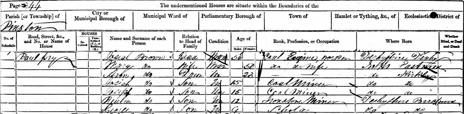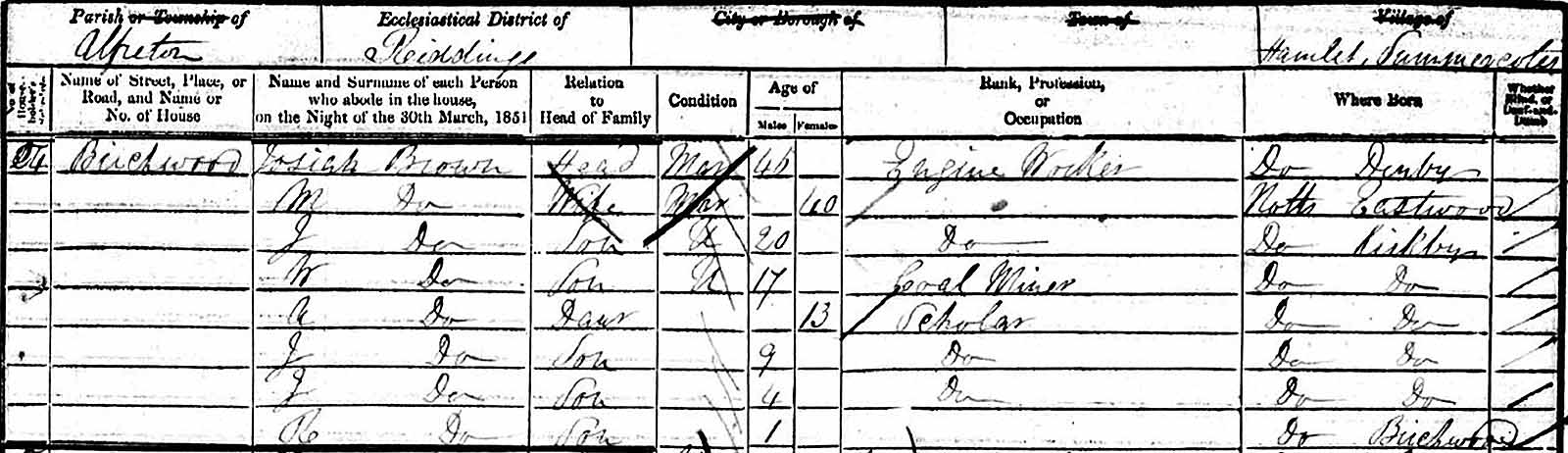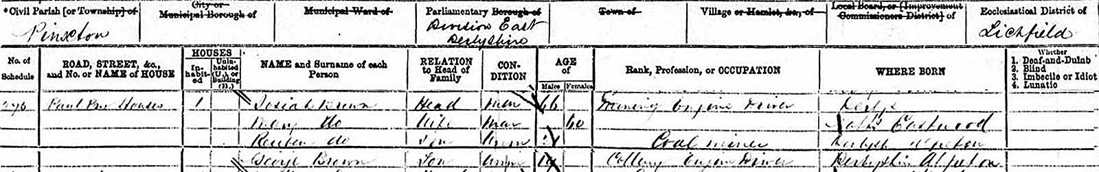 The 1861 census lists Josiah as a coal engine worker, his sons Josiah, and Joseph as coal miners and Reuben, at age twelve, as an ironstone miner. (Ironstone is ore that has high percentages of iron.) Youngest son George, who at the time was nine years of age, was attending school, and categorized as a scholar. In this census, sons Josiah and Joseph are both listed as being fifteen years of age, but this must be an error as other sources show them as being born five years apart.