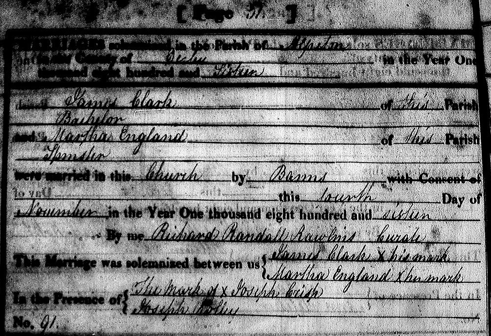 James Clark and Martha England were married 4 November 1816 in St. Martin's Church of the Alfreton, Derbyshire Parish of The Church of England.