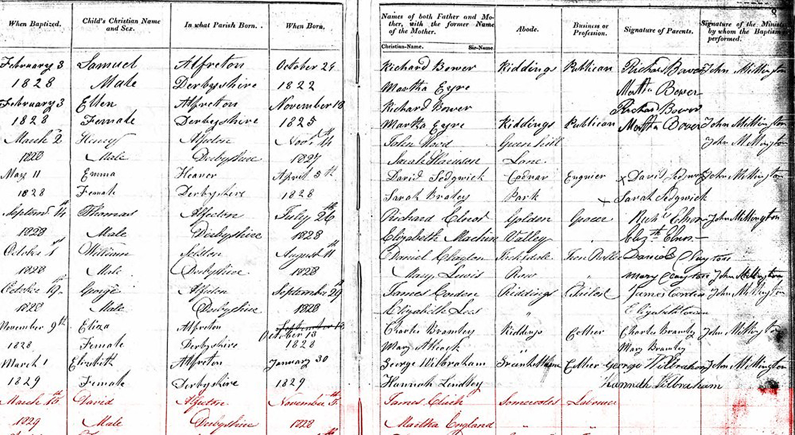 David, a son of James and Martha, was christened in the Independent Chapel of Riddings. The family was still living in Somercotes.