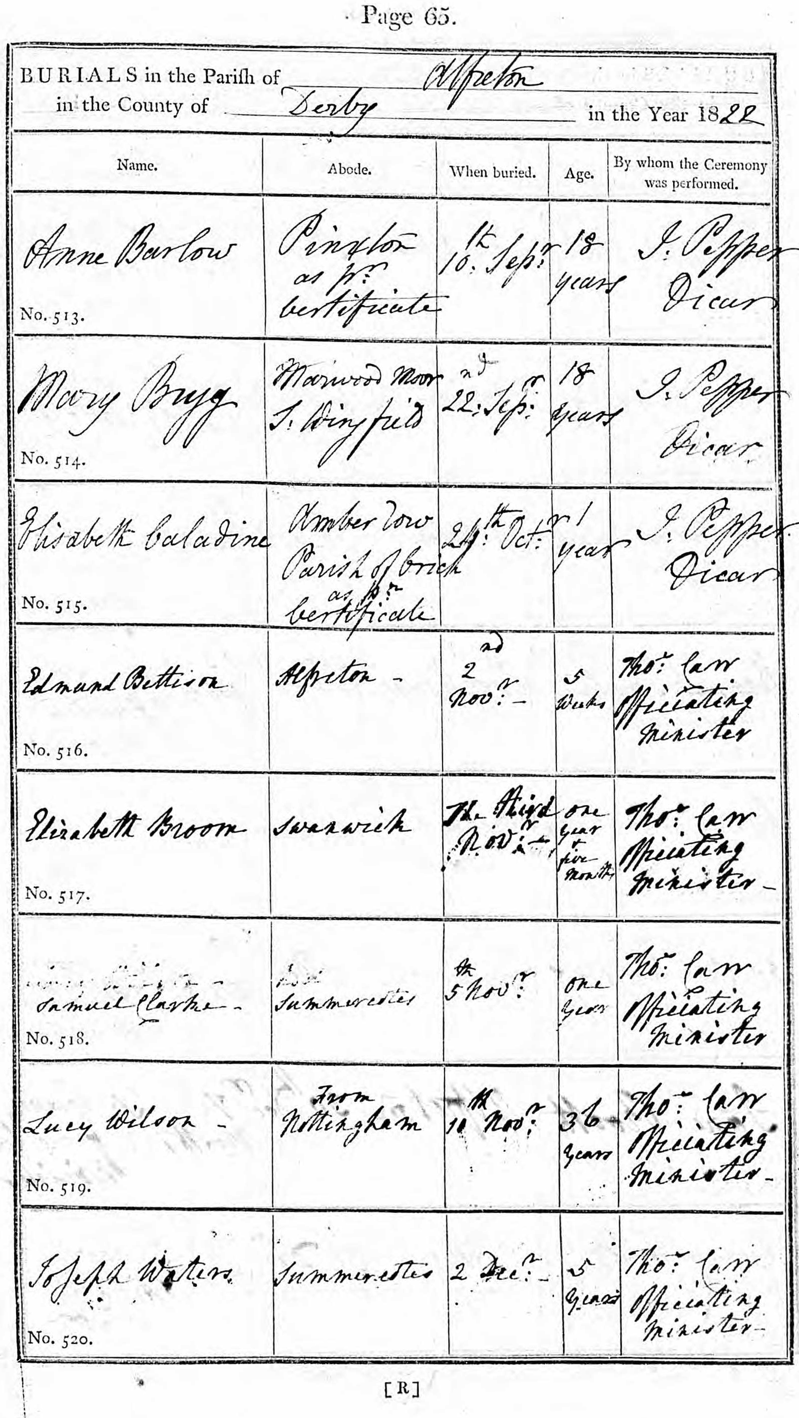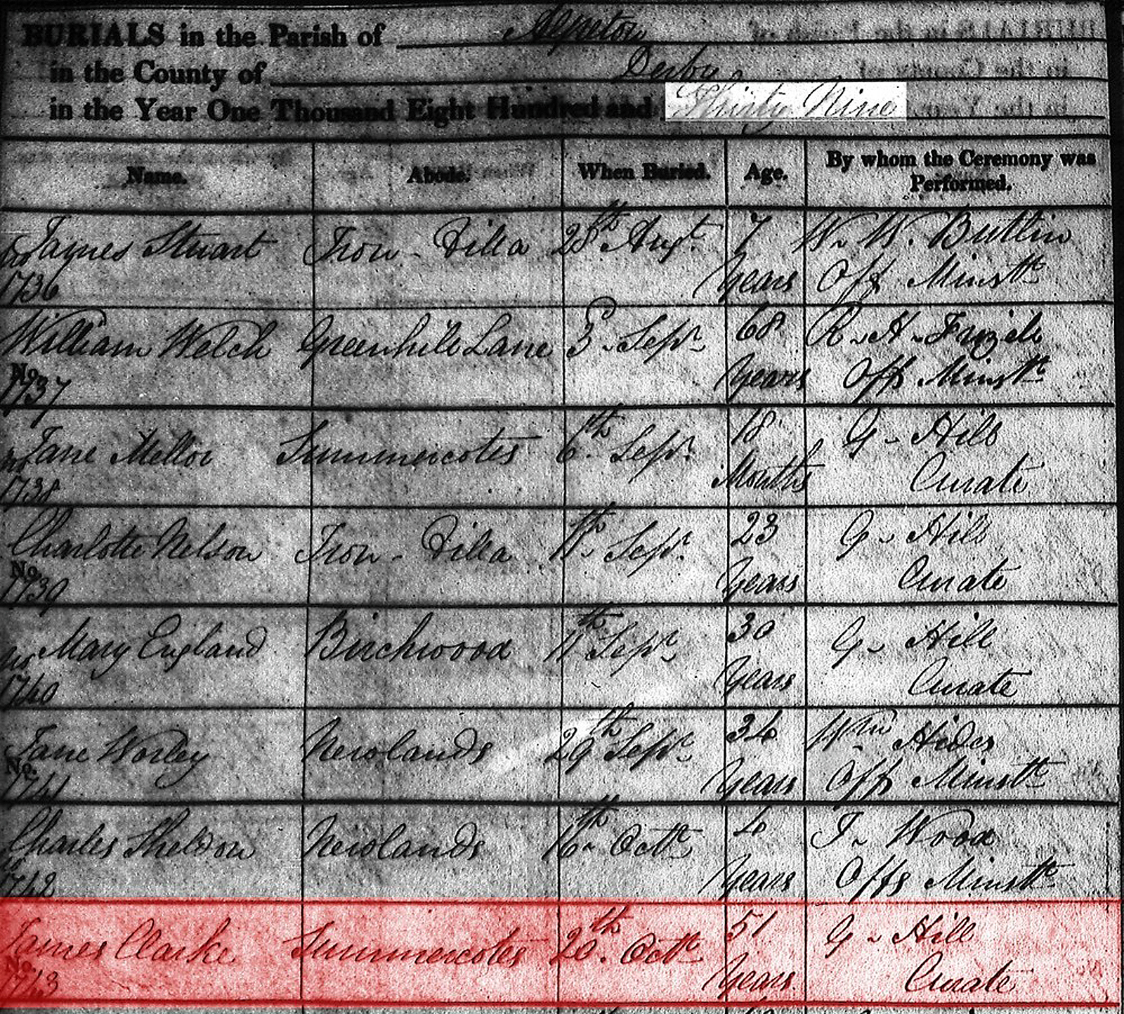 James Clark was buried 20 October 1839 in Alfreton, Derbyshire. He was buried by the Alfreton, Derbyshire Parish of the Church of England.