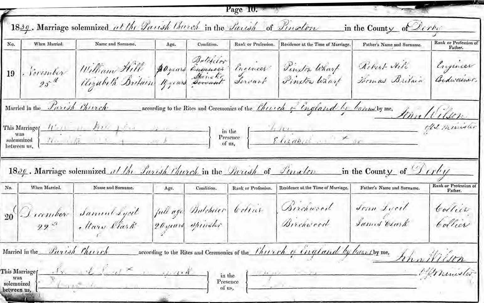 Samuel Clark was married to Mary Hoyland 4 May 1845 in the Pentrich, Derbyshire Parish of the Church of England.