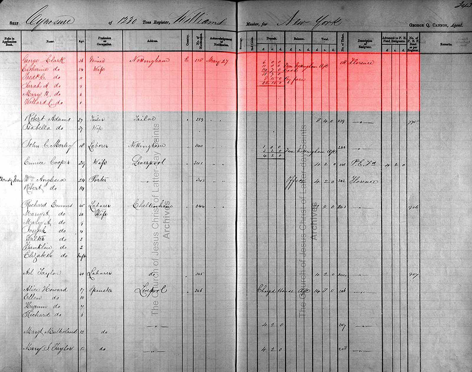 George Clark, his wife Catherine and their children Fredrick C., Sarah A., Mary H. and Willard C. left Liverpool, England on 30 May 1863 on the ship Cynosure, and arrived at New York on 19 July 1863.