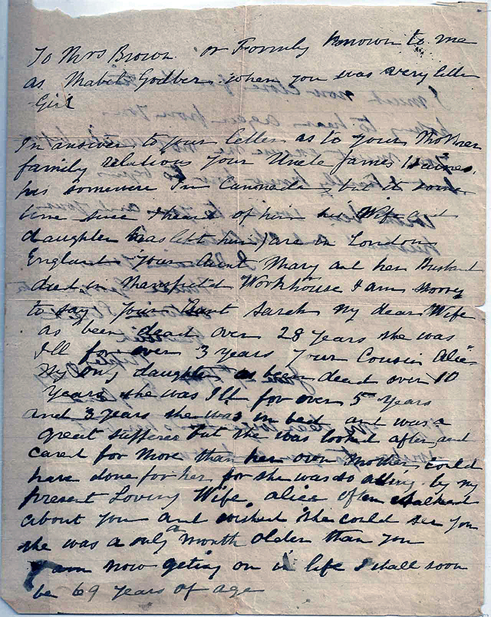 "To Mrs. Brown or formerly known to me as Mabel Godber when you was a very little girl. In answer to your letter as to your mother's family relations, your Uncle James Hames, he's somewhere in Canada, but it some time since I heard of him. His wife and daughter has left him, and are in London, England. Your Aunt Mary and her husband diedWhen people could no longer support themselves, and were declared paupers, they were often put into workhouses to be cared for by the government.