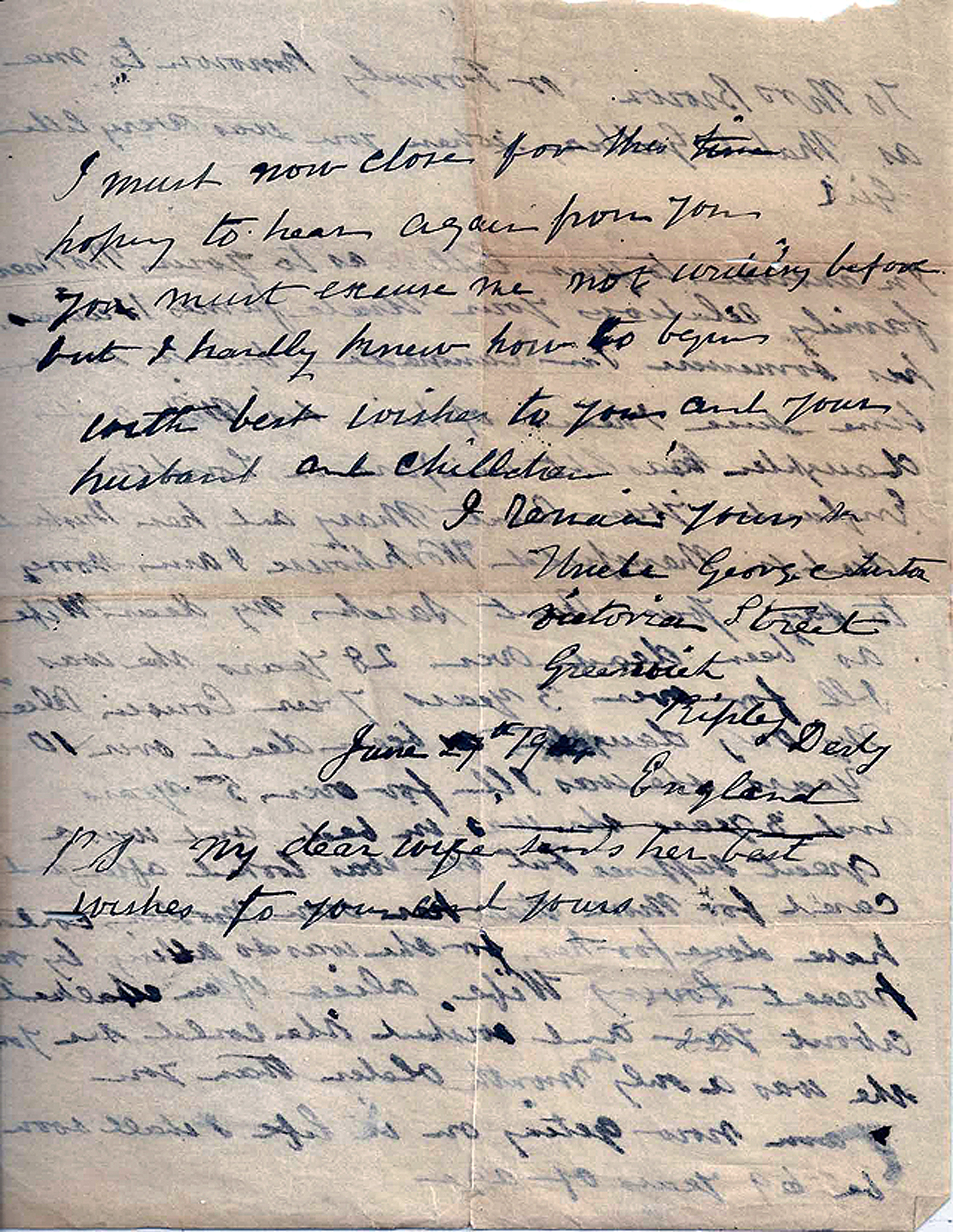 I am now getting on in life and shall soon be 69 years of age. I must now close for the time, hoping to hear again from you. You must excuse me not writing before but I hardly knew how to begin. With best wishes to you and your husband and children