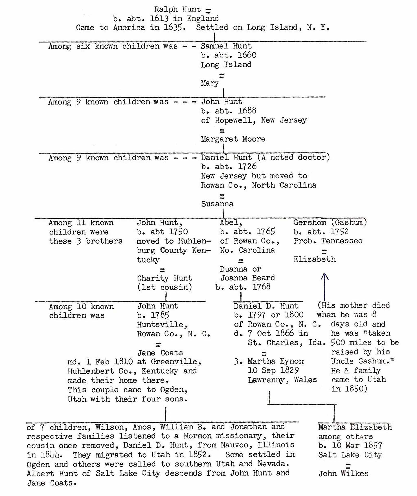 This particular Hunt family is old in America, and at least one other branch of the family has long since compiled its history. In fact, it has established its genealogy from generation to generation to the earliest arrival in America. Particularly, this has been so with a Hunt Family Research Association which was centered in Utah, and claims descendancy from one John Hunt, who married Jane Coates, originally from Kentucky, who later moved to Iowa, and who, at least by the mid 1850s came to Utah where John died in Ogden in 1857.