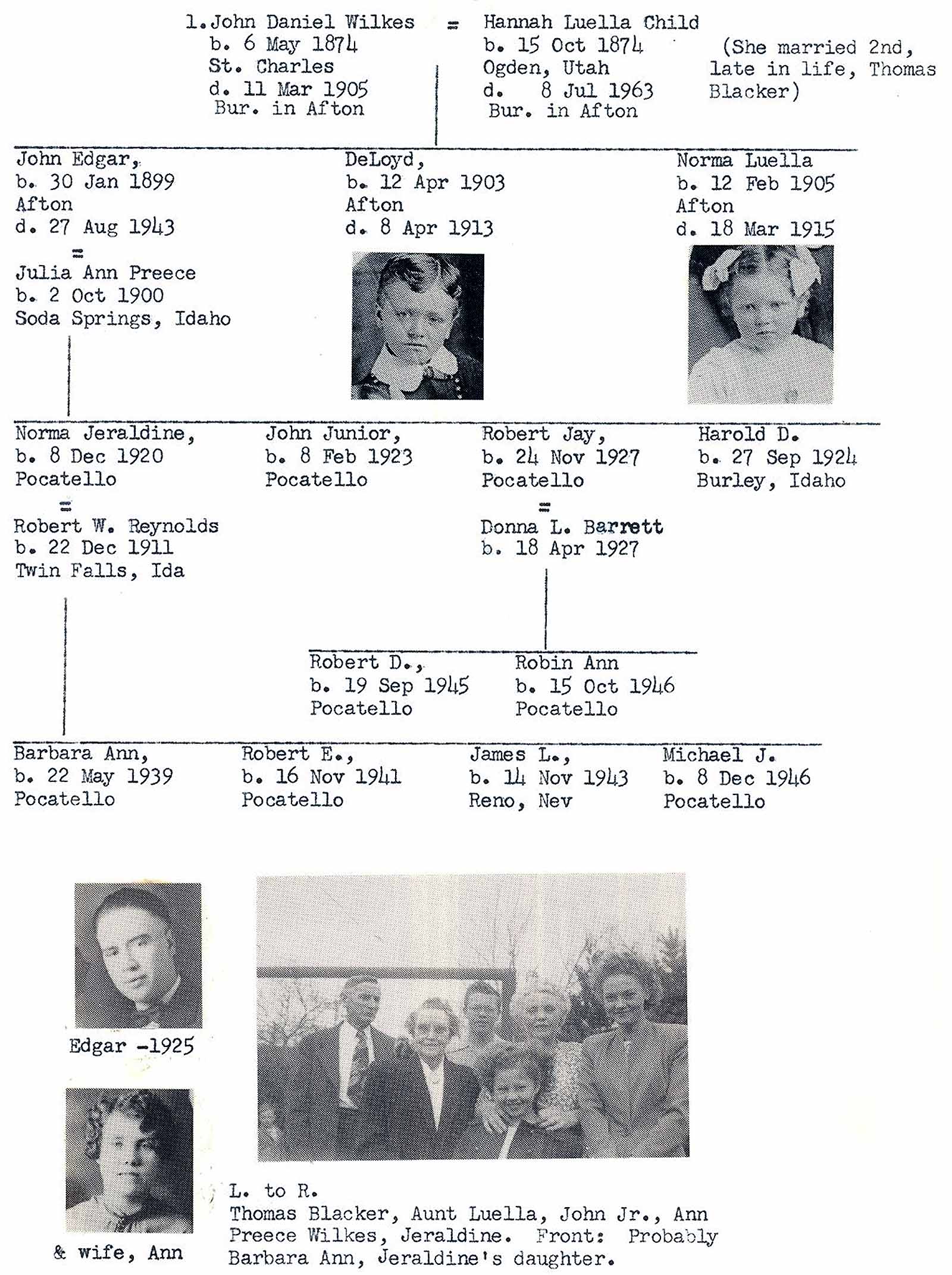 Family chart for John Daniel Wilkes and Hannah Luella Child Wilkes