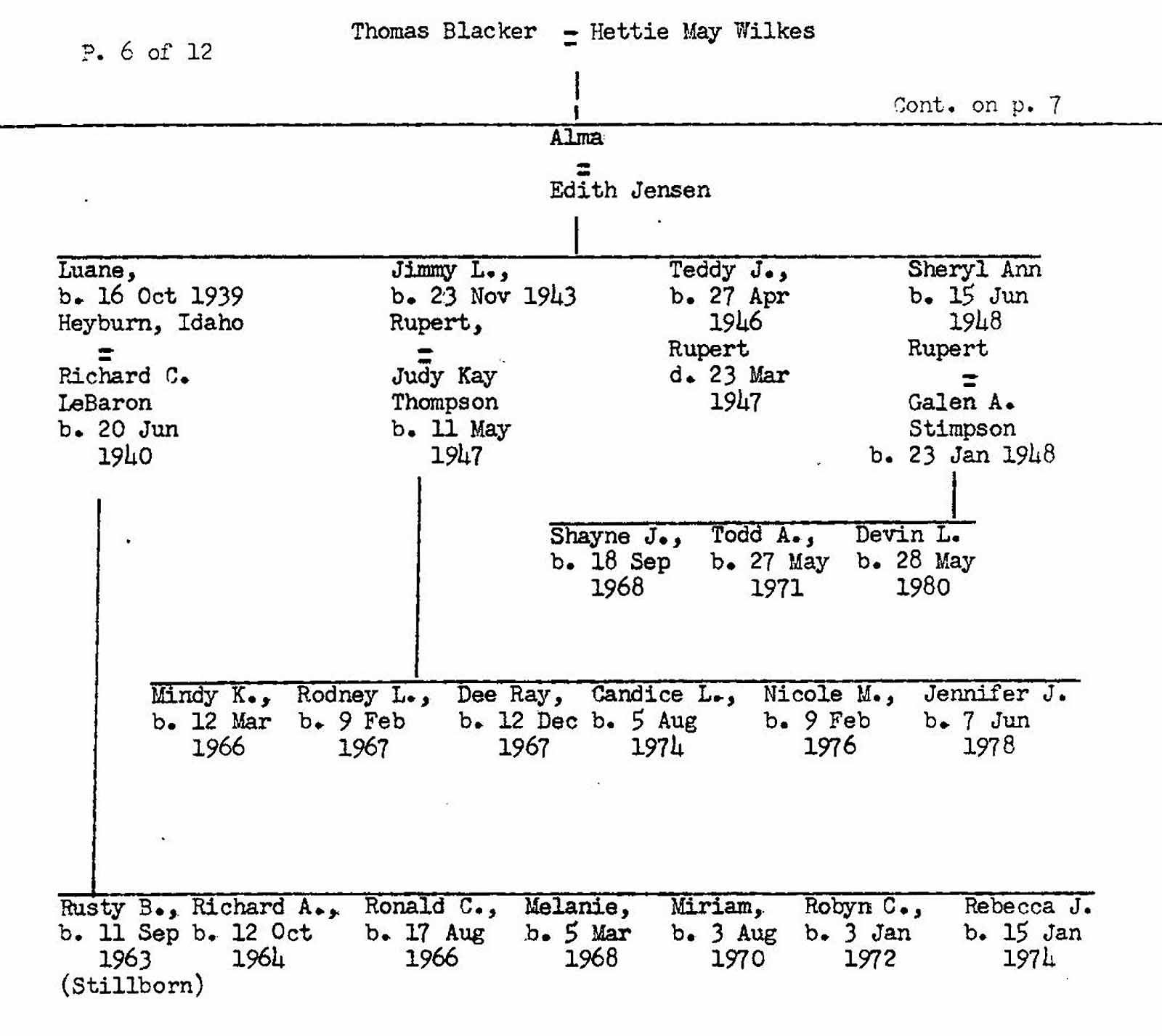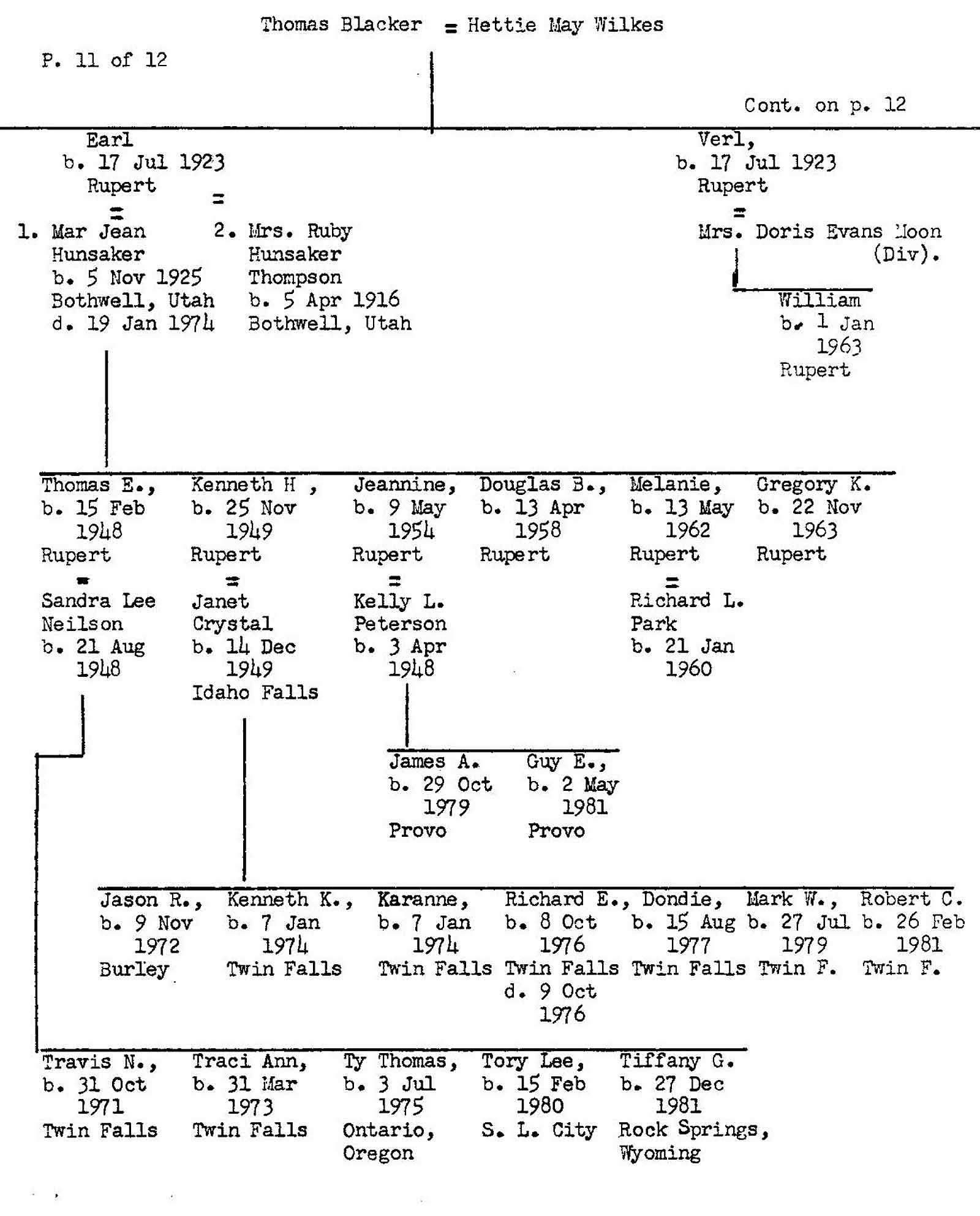 As with other families, the Thomas and Hettie Wilkes Blacker story is far too long to be fully reviewed in this account. Seven of us living children made the move with our parents to Idaho, and four additional ones, Merintha, on the 8th of December 1920, twin boys, Earl and Verl, arrived on the 17th of July 1923, and lastly, baby Marie on the 17th of September 1925.