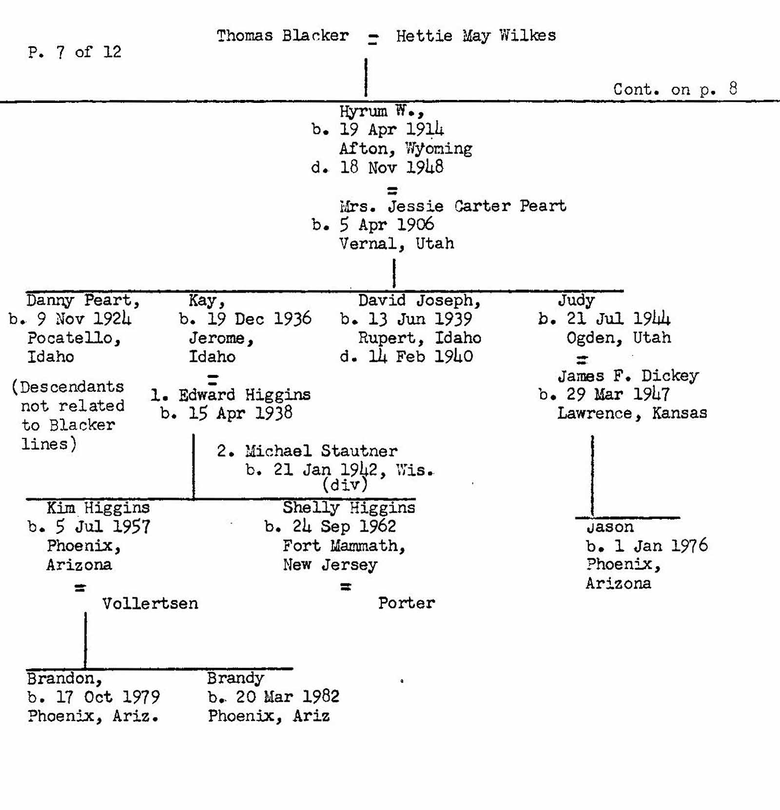 Hyrum Blacker: Hyrum, naturally spent his growing up years at home. Following high school years Hyrum found employment locally and on the 6th of Sep. 1934 married Jessie Carter Peart who had been married previously with a little son. To them were born a girl, a boy who passed away in what they call 'crib' death at the age of eight months on the 14th of February 1940. Another little girl arrived four years following this tragedy. Hyrum was employed in the grocery business in Ogden for a few years and they returned and ran the old family farm for a couple of years here in Rupert. In 1947 Hyrum, Jessie and their two little girls purchased a small grocery business in Vernal, Utah, which they were operating when Hyrum suddenly passed away on the 18th of November of 1948. Jessie continued with the store for a short while, but found it was too much for her to continue with it. She eventually moved into the Phoenix, Arizona, area where her girls grew up and married and where they are still residing. Jessie still (1984) lives alone in an apartment in one of the girl's home. Hyrum was buried in the Rupert cemetery.