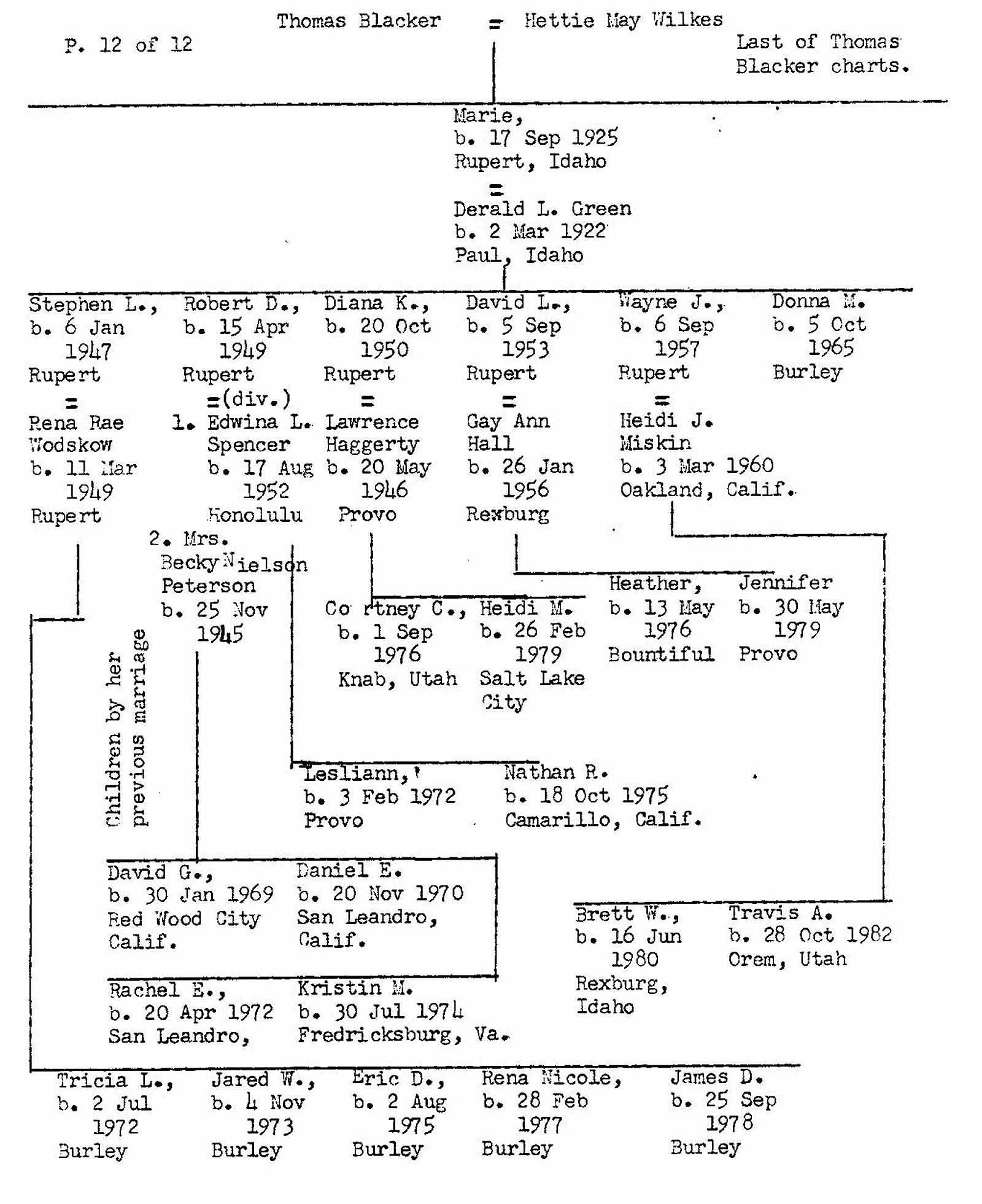 Marie Blacker Green: Following high school Marie was employed by the local J.C. Penney Company for some time. On the 9th of November 1945 she and Derald Green, son of then stake president, were married in the temple. Derald had seen service in World War II. They farmed west of Paul, Idaho, most of the time their six children were growing up. After their farm was paid for, it seemed wisdom on their part, rather than keep investing in expensive machinery, they concluded to lease the farm ground to neighbors providing he could take and pass a mail-carrier examination for the U.S. Postal System. This he did and secured a rural route out of the Paul post office.