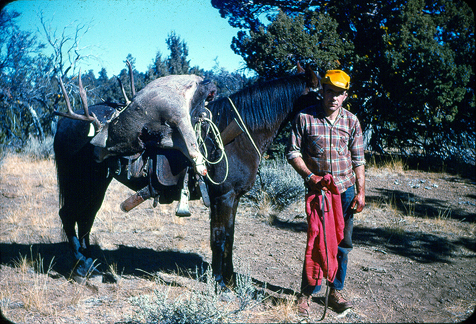 Me with bloody hands and "Babe" one of our horses packing a deer to camp.